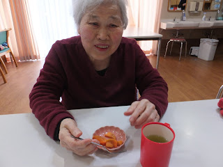 おやつは、秋の味覚の柿です。今年は豊作でどこの木にも沢山出来ていますね。みのりでも秋の味覚を沢山楽しみました(^^♪