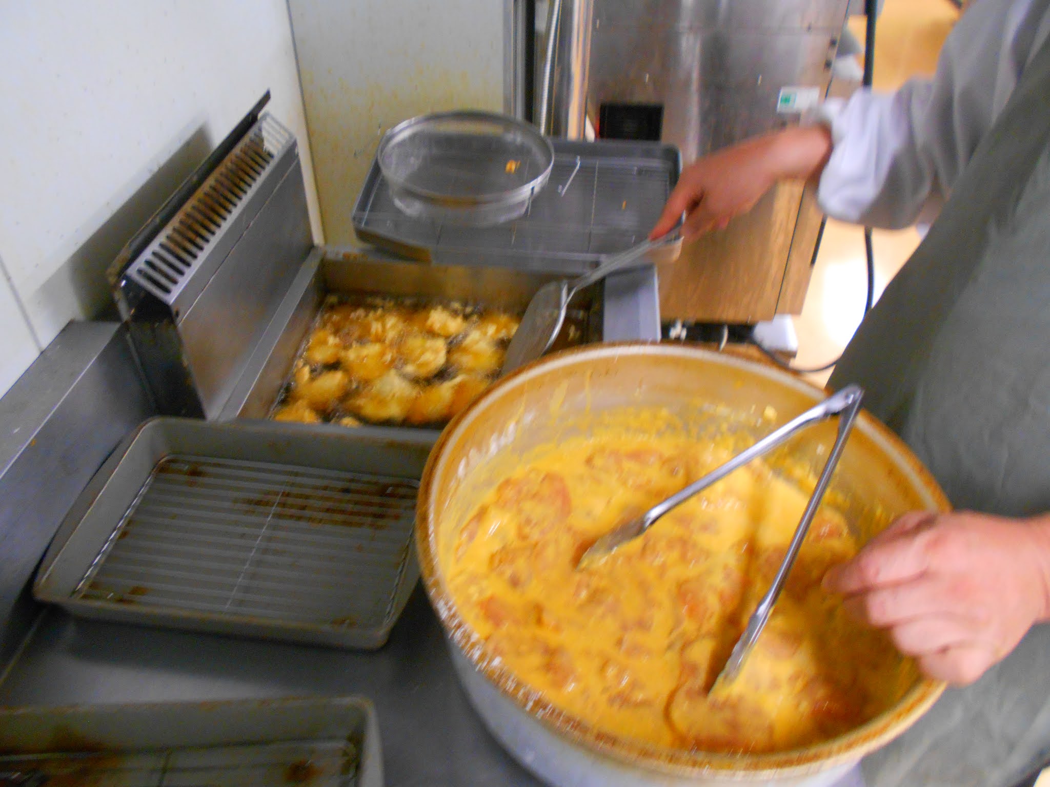そのあとは鶏肉を卵液に付けて1つ1つ丁寧に揚げていきます。