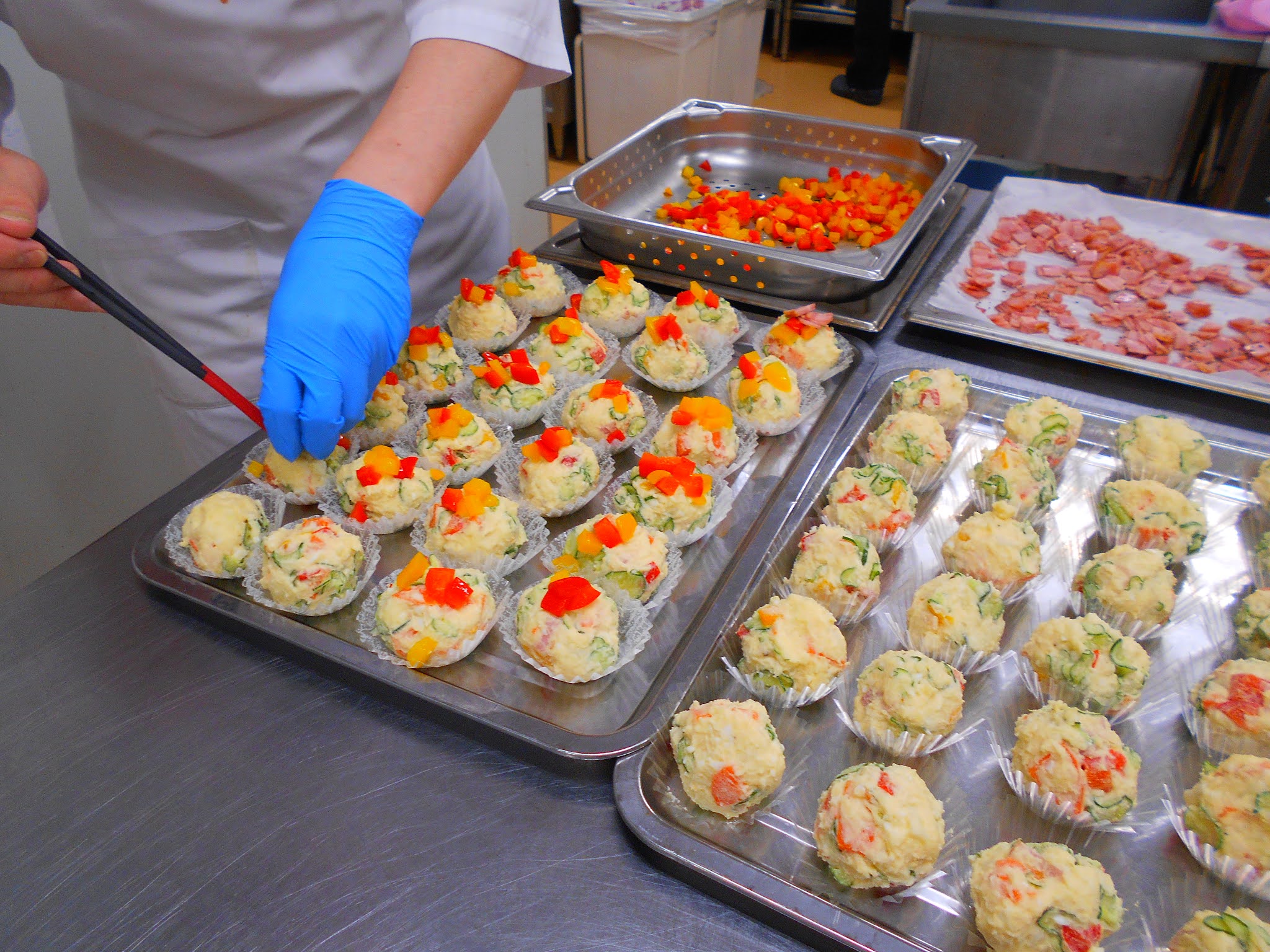 揚げ物を揚げている最中も別の職員は盛り付けをしています(^^)/