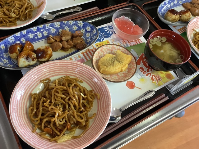 昼食は屋台風メニュー。焼きそば、焼き鳥、たこ焼き、たい焼きにスイカゼリー☆