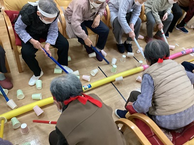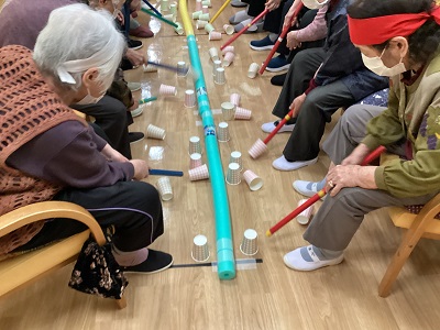 相手の陣地に紙コップを棒で送り合います!