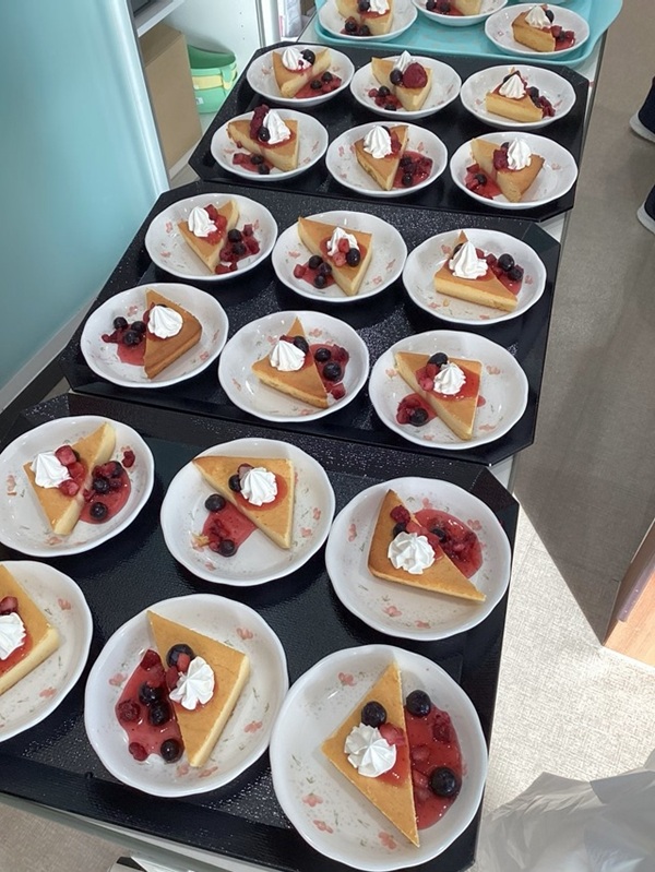 おやつには、チーズケーキに生クリーム・ベリーソースなどをトッピングしたケーキを提供しました。