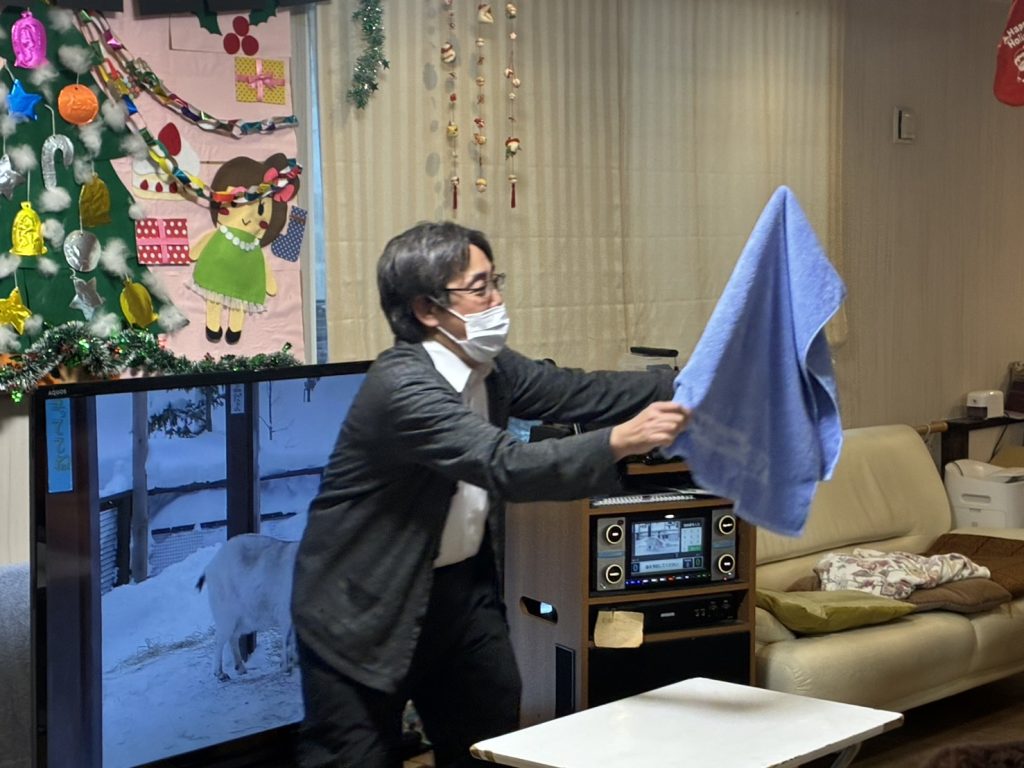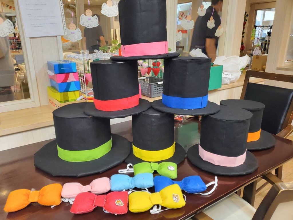 手作りのハットと蝶ネクタイで演出、最後はテーブルクロス引きをしました。