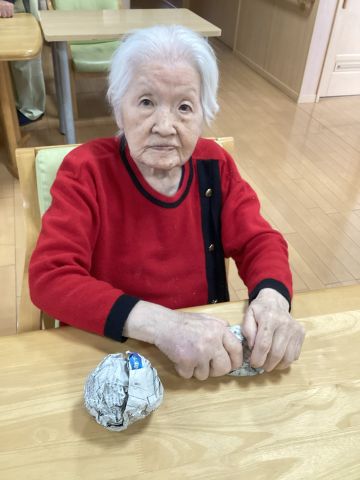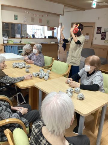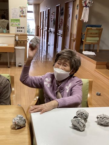 先日の節分でお客様と新聞紙を丸めた物を作って、鬼に扮した職員に投げていただきました!