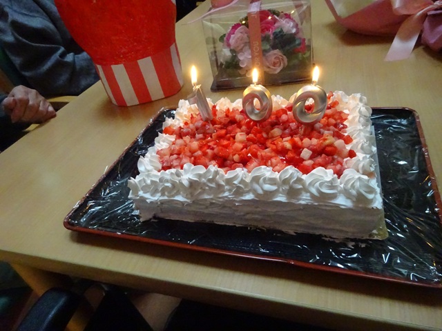 大きな手作りケーキに百歳のローソクを立て他のお客様に手伝ってもらい、とても盛り上がりました。「おいしい」と何度も言われ喜ばれています。